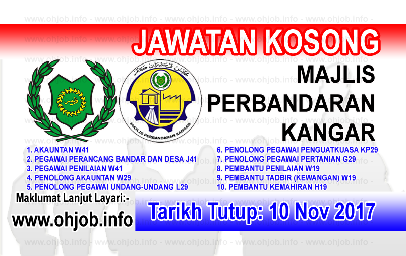 Jawatan kosong 2017 di majlis perbandaran kangar (mpk) | permohonan adalah dipelawa daripada warganegara malaysia yang berkelayakan dan berumur tidak kurang dari 18 tahun pada tarikh tutup iklan ditawarkan untuk memohon jawatan kosong di majlis perbandaran kangar (mpk)latar belakangsebelum tahun 1956, kerajaan tempatan di negeri perlis terletak di bawah town board enactment f.m.s.